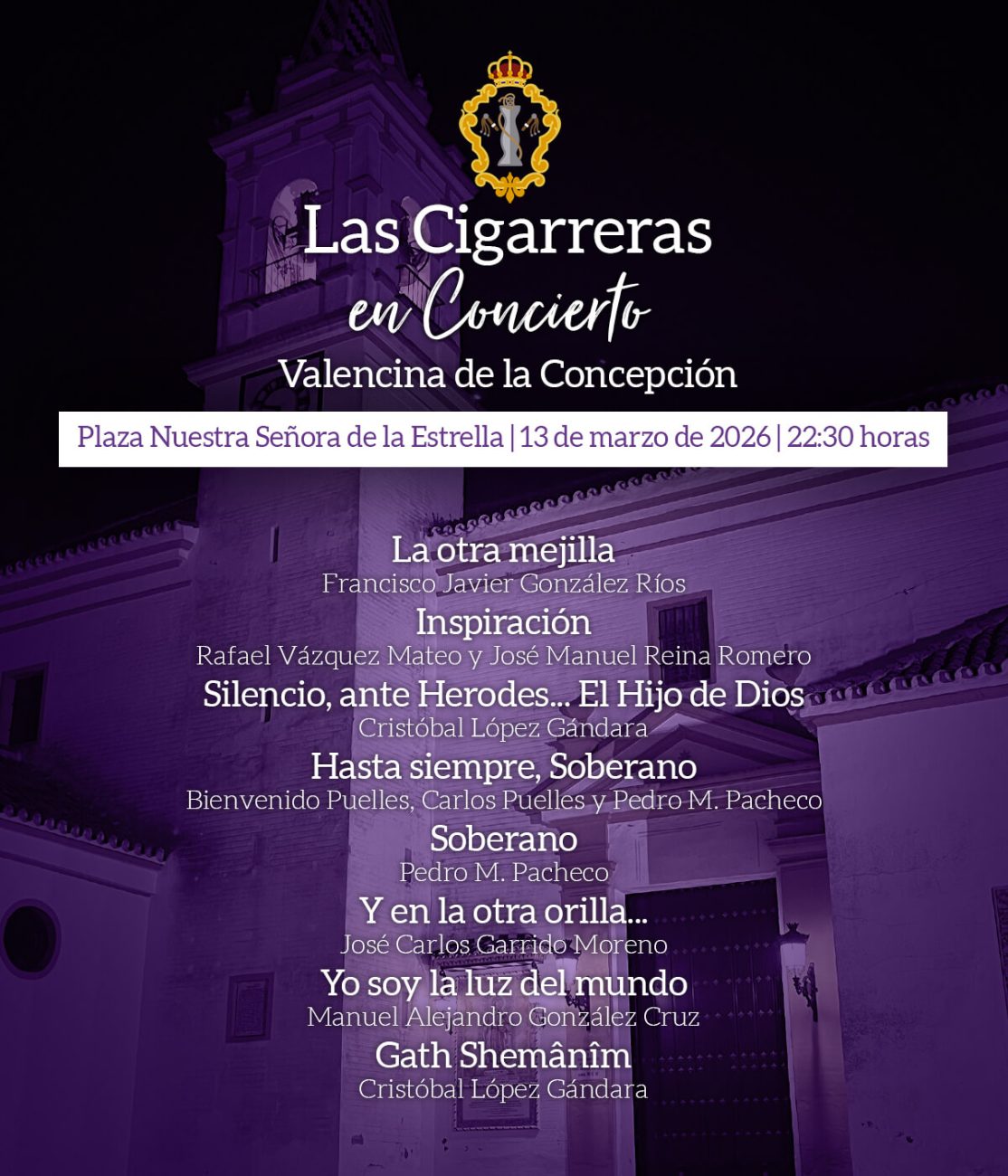 Presentado por el querido Francisco José Borge, y bajo la batuta de nuestro director musical Rafael Vázquez, a partir de las 21 horas se podrán escuchar las siguientes composiciones:
